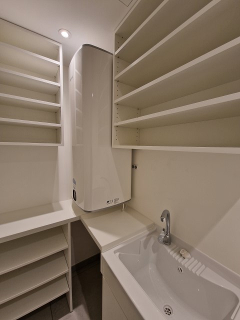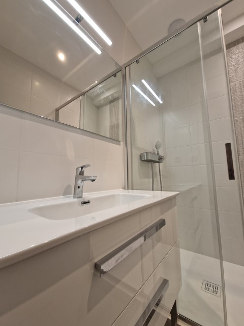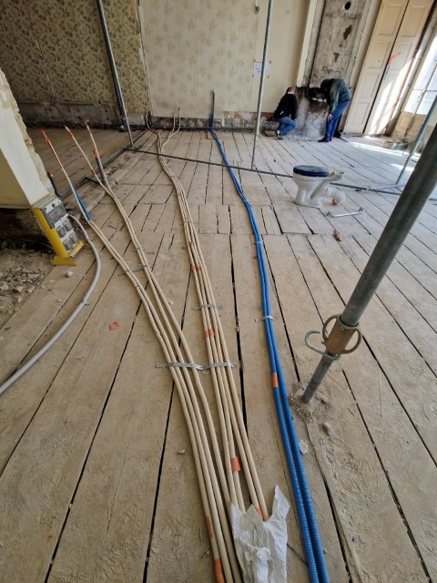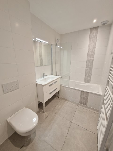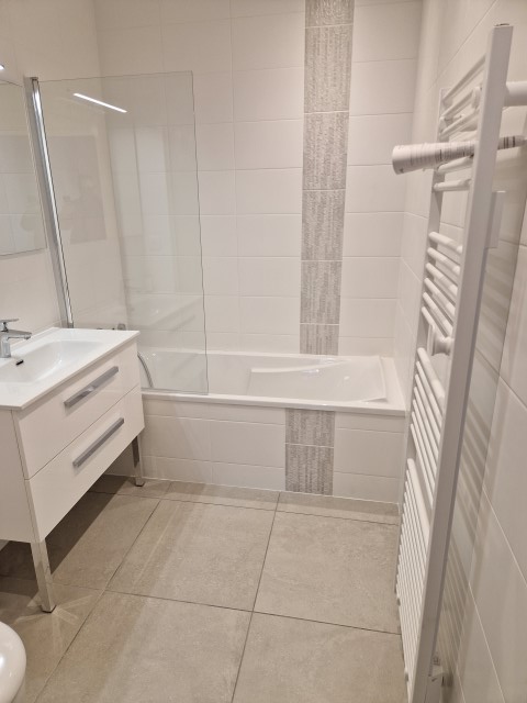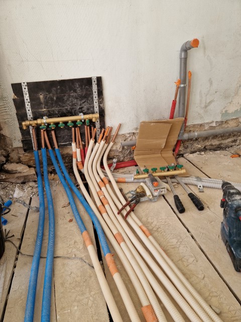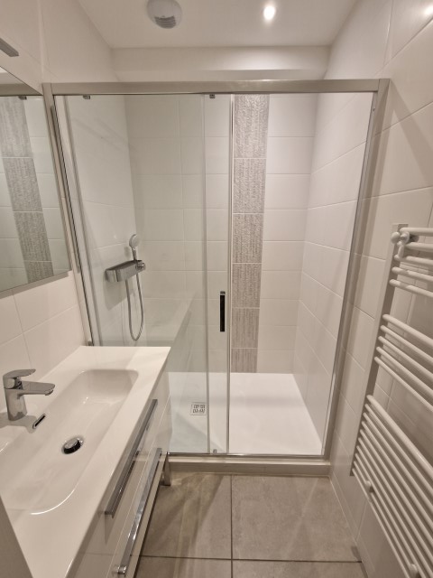 Après une mise à nue totale de l’appartement, nous avons recréé les réseaux d’eau chaude, d’eau froide et d’évacuations. Suite à cela nous avons créé 2 salles de bain avec douche et baignoire, 2 WC suspendus, une cuisine et une buanderie avec évier et chauffe-eau.