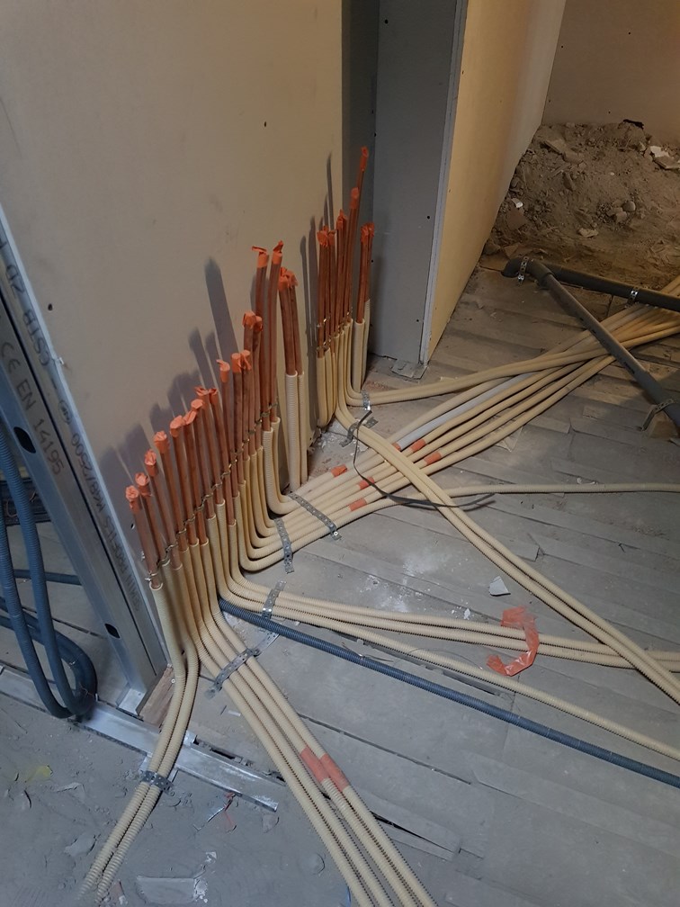Rénovation d’un duplex avec 2 radiateurs fonte noir style rococo dans le salon et radiateurs acier charleston dans les autres pièces. Création de 2 salles de bain, douche et baignoire. Installation de la climatisation.
